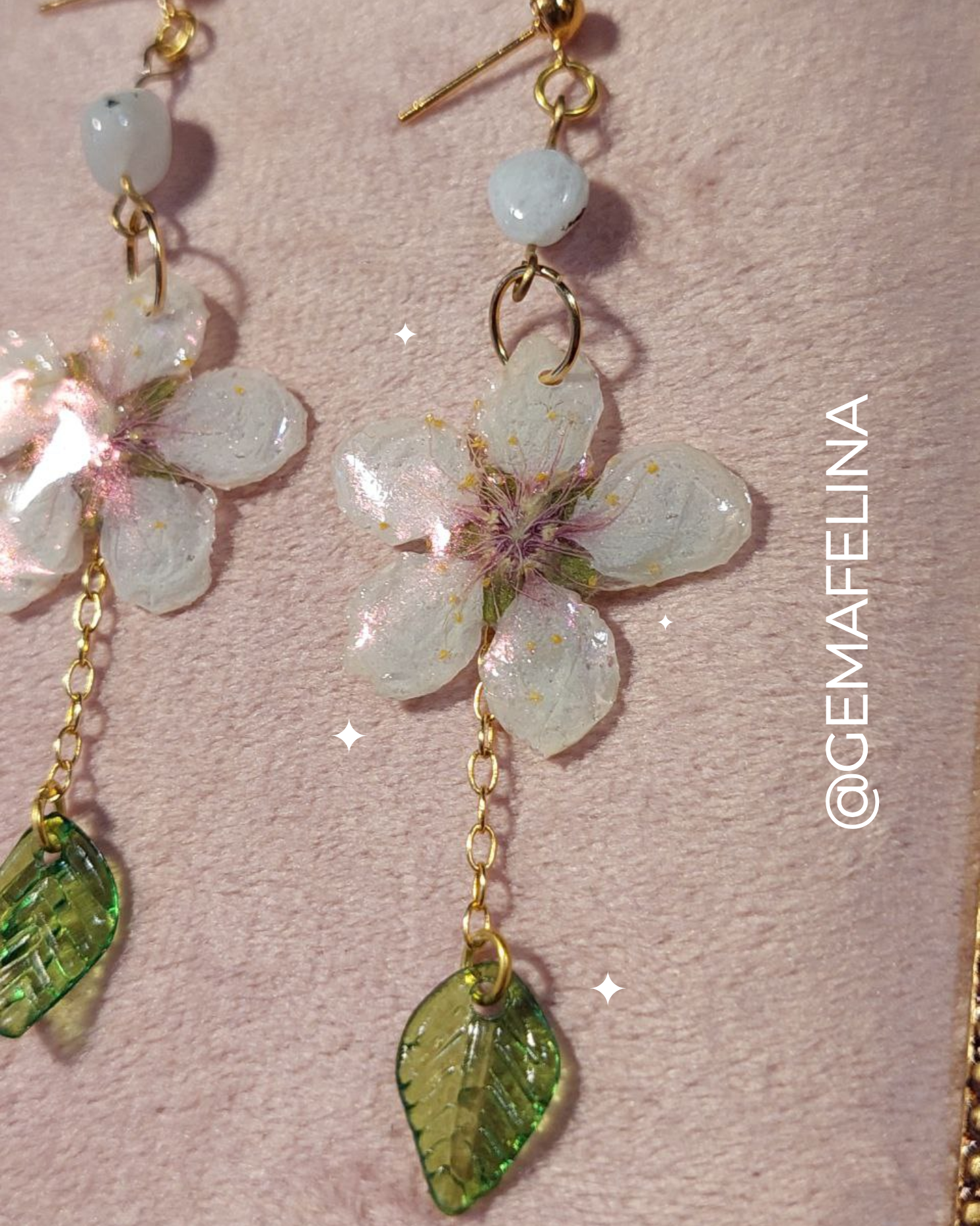 Aretes de flor de durazno con labradorita blanca, hechos a mano con flores de durazno naturales encapsuladas en resina epoxica y acompañadas de labradorita blanca y  broquel chapado en oro. Son accesorios únicos que realzan cualquier estilo.
